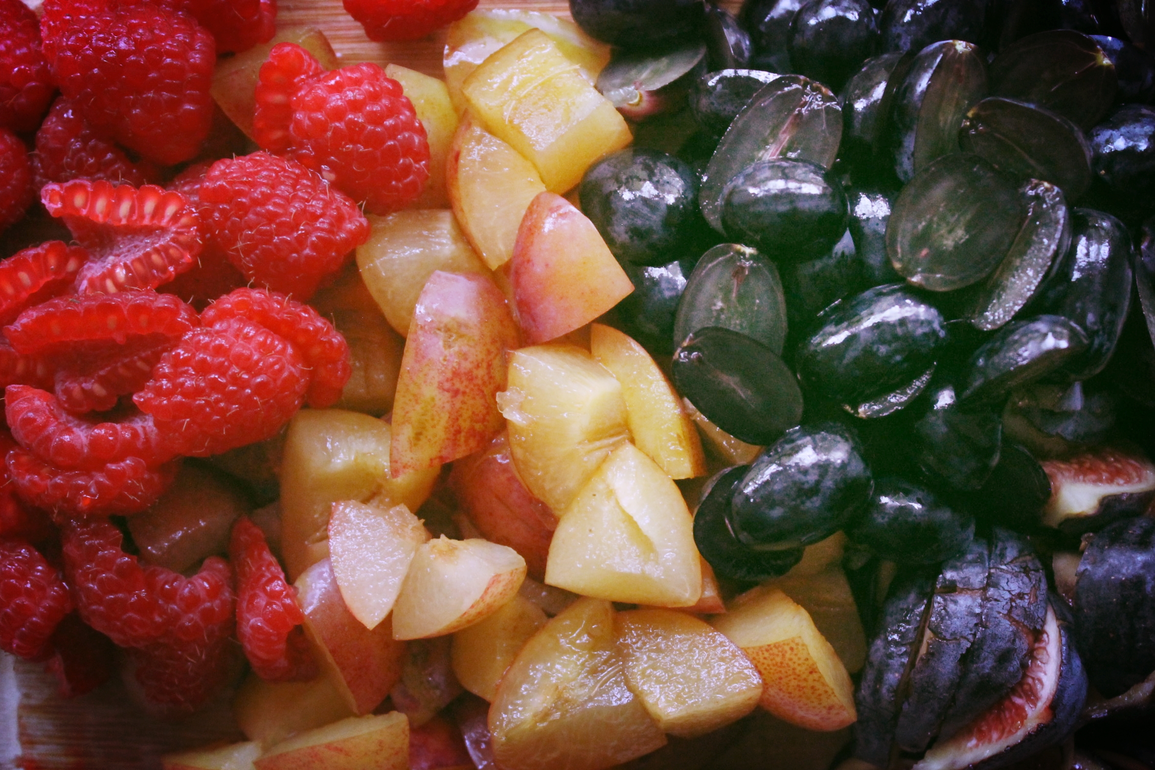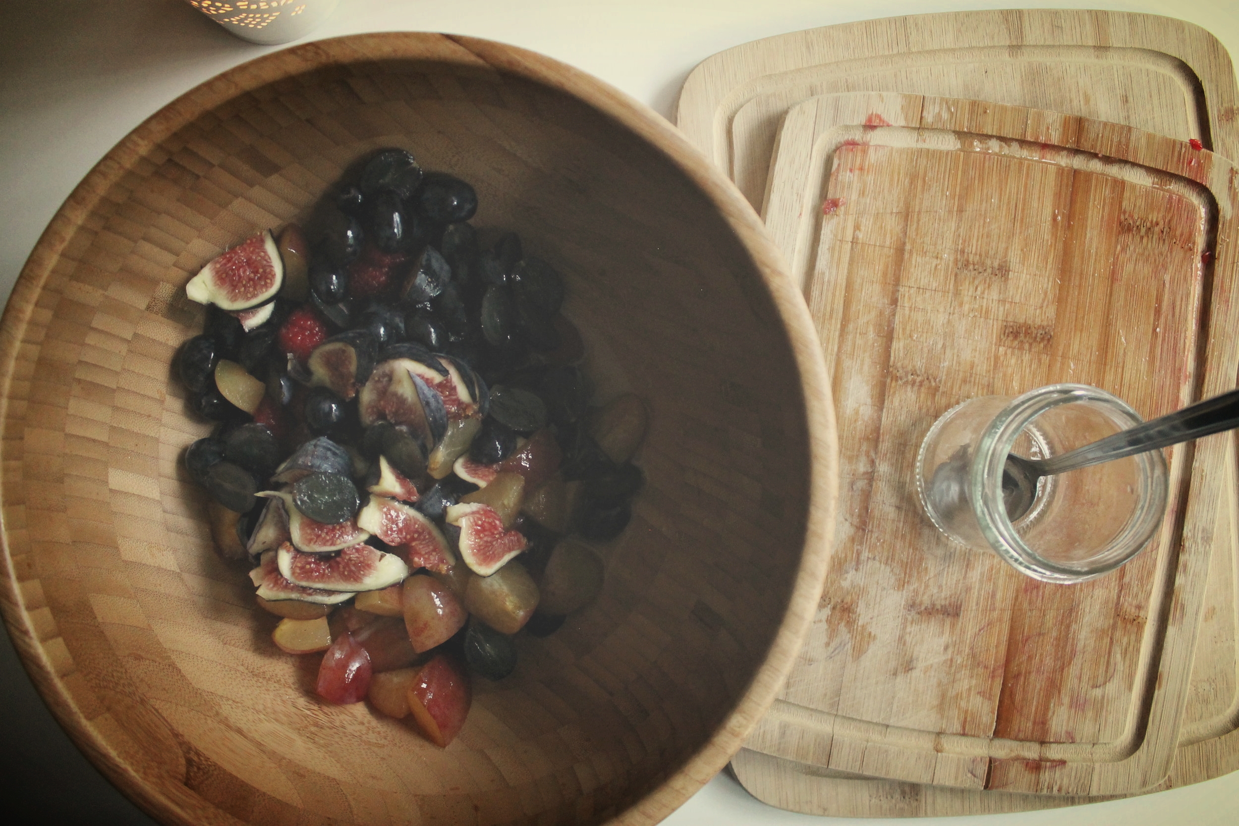 This late summer fruit salad takes its inspiration from the many fruit salads I’ve tried over the years (my mom used to make loads of beautiful fresh fruit salads when we were kids) and the fleeting summer season. At the market I picked up some lovely borage honey from the London Honey Co, a light honey from the blue starflower (another name for borage). I wanted a light and summery honey to add a little something extra to the beautiful Victoria plums, raspberries and black grapes in this salad, and this luscious honey definitely fit the bill. I also picked up a few sweet figs to add to the mix because I simply couldn’t resist them when I laid eyes on them!